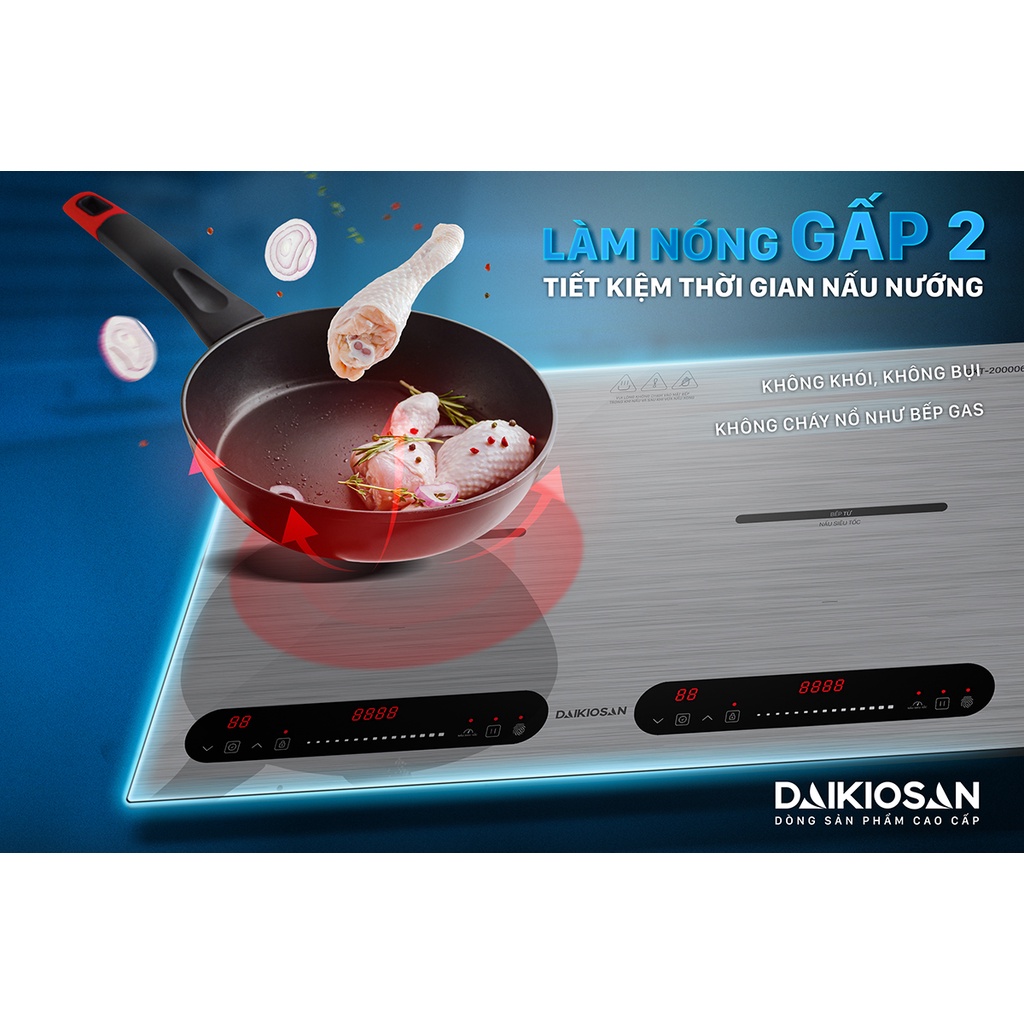 Khả năng truyền nhiệt nhanh của bếp từ đôi Daikiosan DKT-200006 cũng giúp mọi món ngon đều được nấu chín nhanh chóng, nên bếp điện từ 2 vùng nấu Bếp từ đôi Daikiosan DKT-200006 là giải pháp hoàn hảo cho những gia đình bận rộn, muốn ăn ngon tại nhà mà vẫn tiết kiệm thời gian nấu nướng. Ngoài ra, bếp từ đôi Daikiosan DKT-200006 có nhiều mức độ nhiệt khác nhau, tùy vào từng món ăn mà bạn có thể lựa chọn chế độ phù hợp