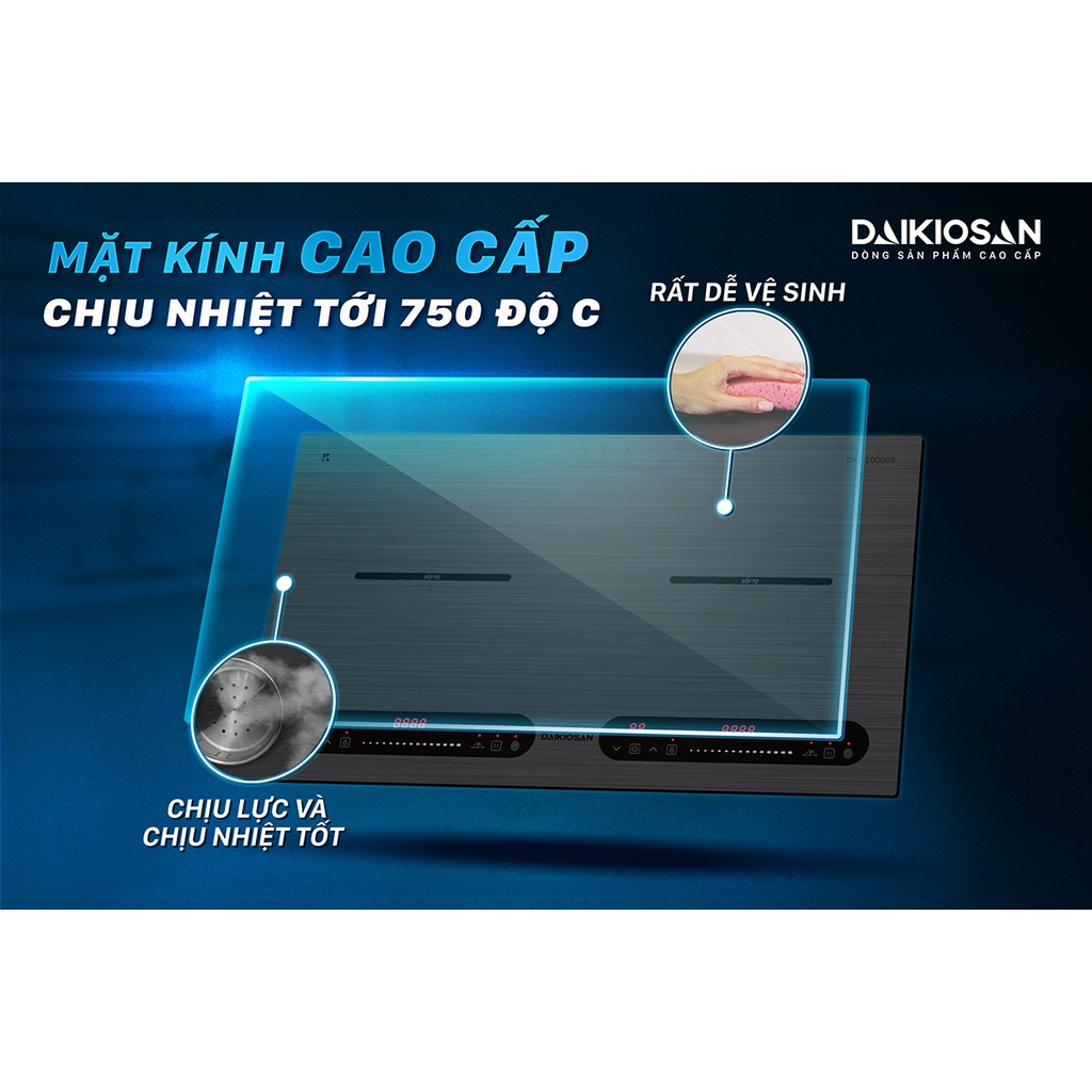 Bếp từ đôi Daikiosan DKT-200006 sử dụng loại mặt kính chịu nhiệt cao cấp với nhiều ưu điểm nổi bật như:
